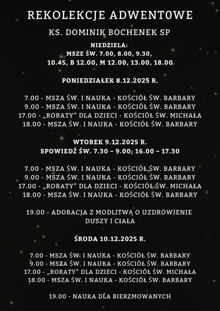 Rekolekcje Adwentowe 2025 Post published:1 grudnia 2025 Może ci się spodobać również „Rozeznawanie duchowe – podejmowanie decyzji” 19 kwietnia 2023 Wizyta duszpasterska 22-27.01.2024 23 stycznia 2024 Rowerowa Pielgrzymka Rodzin na Jasną Górę 26 sierpnia 2025